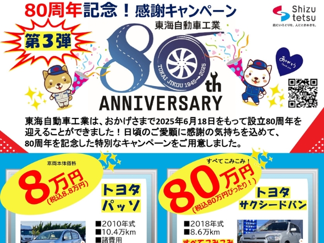 創業80周年の「ありがとう」を込めて、6月18日の記念日から 撥水コーティング、ヘッドライトクリア を各々 ワンコイン未満の80円 でご提供します。日頃お世話になっているお客様はもちろん、はじめてご来店の方も大歓迎。梅雨の視界をクリアにして、安全・快適なドライブをお楽しみください。